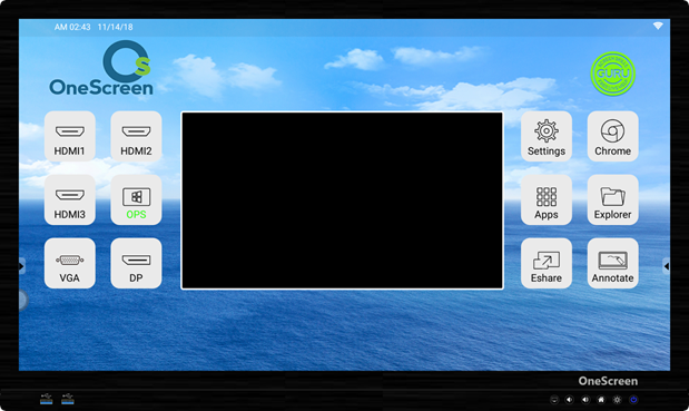 | Pressing this icon will make the On-Board PC Source (OPS) as the active input source. Once selected, tap on the mini screen to switch to the respective source. |