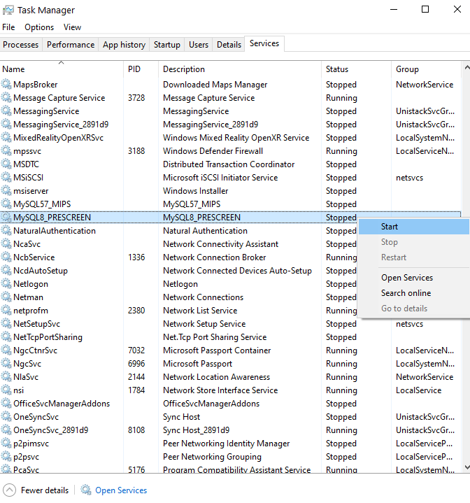 Step 2: Open the Services tab, find the service in the image below and check if it is “stopped”. Right click on the service and click start.