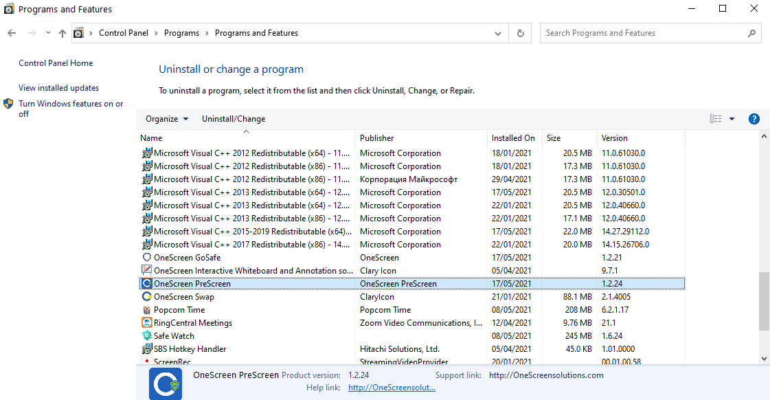 Step 5: Search for “OneScreen Prescreen” (highlighted below) in the list of programs and then click on uninstall/change (marked below).