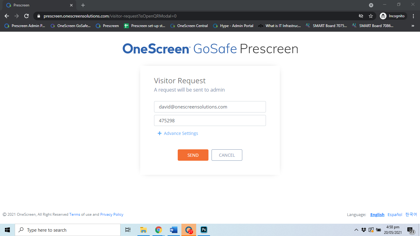 Step 3: The visitor will need to enter their email along with the company ID. They can also choose a start and end time for their visit if needed by clicking on “Advance Settings”.