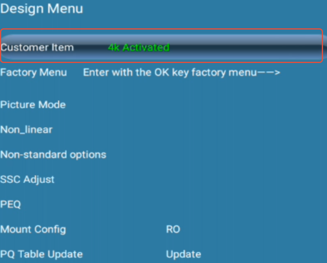 - Enter 2 5 8 0 on the remote control successively to enter the factory menu mode